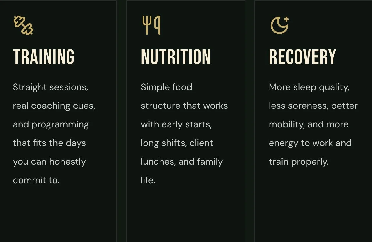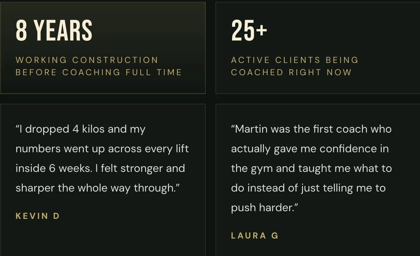 The Trade Ready Body Guide gives you the exact starting system Martin uses to get busy men training, eating, recovering, and performing properly again.